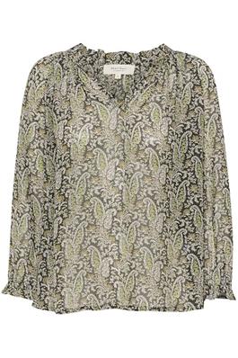 Fin bluse med v-hals. Går inn i ermene nederst med strikk og rysjer. Også rysjer i halsen.