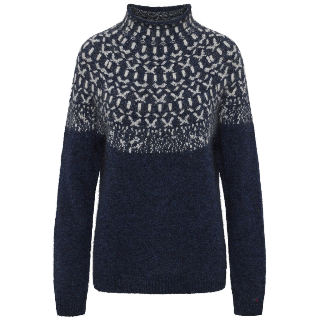Fin mønstret ull genser med høy hals. Ribbestrikka nederst på armer og bolen.