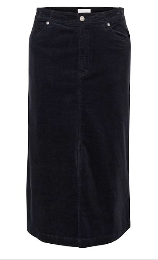 Si cordskjørt , splitt foran. Lommer bak og foran. Knapp og glidelås foran for lukking.