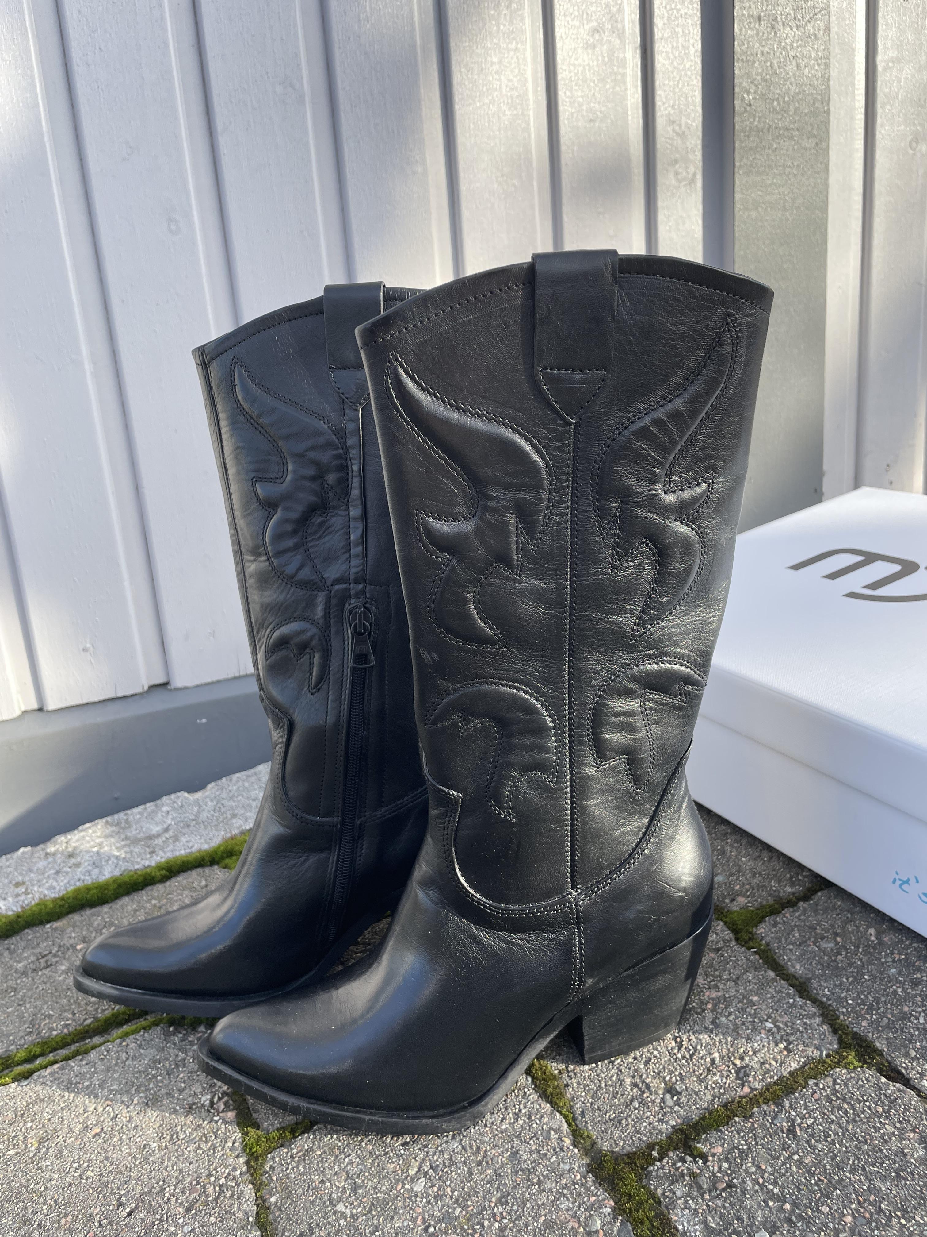Cowboy boots i sort skinn. Liten hel og spiss tupp. Lukkes med glidelås på innsiden.