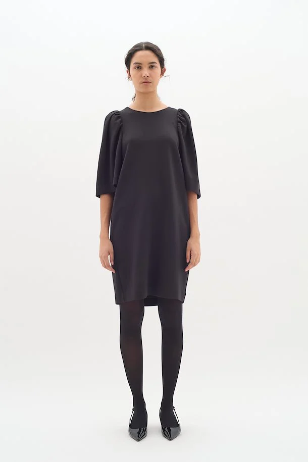 Enkel kjole med puff-ermer. Lengde til knærne.