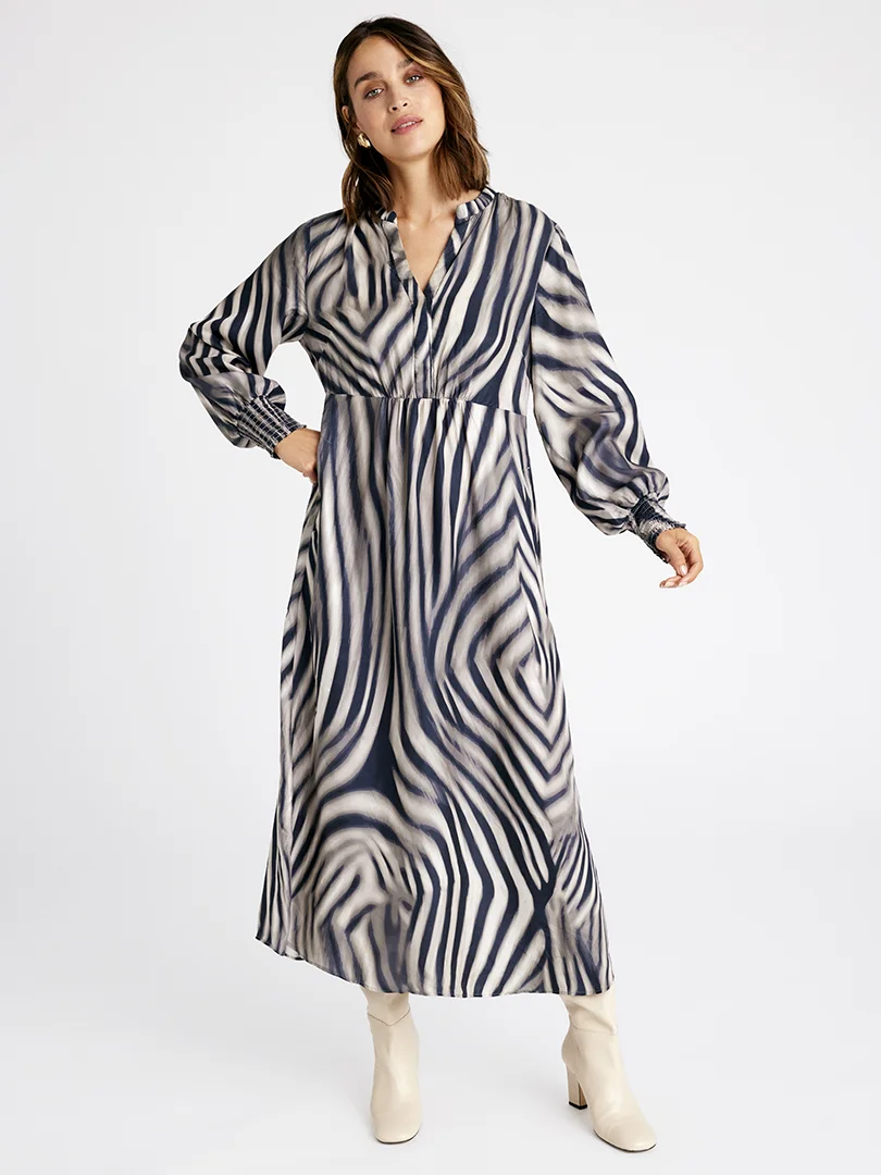Nydelig lang kjole fra Gustav! Passer til mange anledninger. Den har en v-hals, strikk nederst på ermene og to lommer på siden.