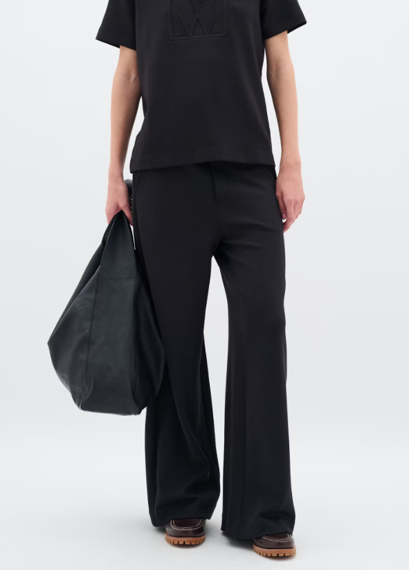 Myke bukser med stretch. Strikk i livet og stikklommer på begge sider. Vide i beina.