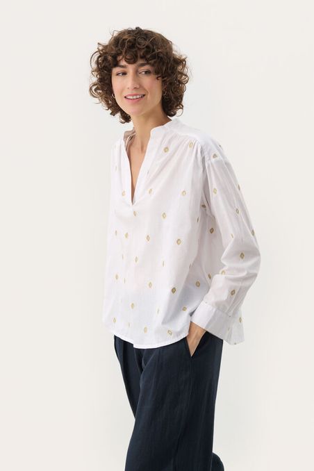 Lett bluse med broderier i gull.