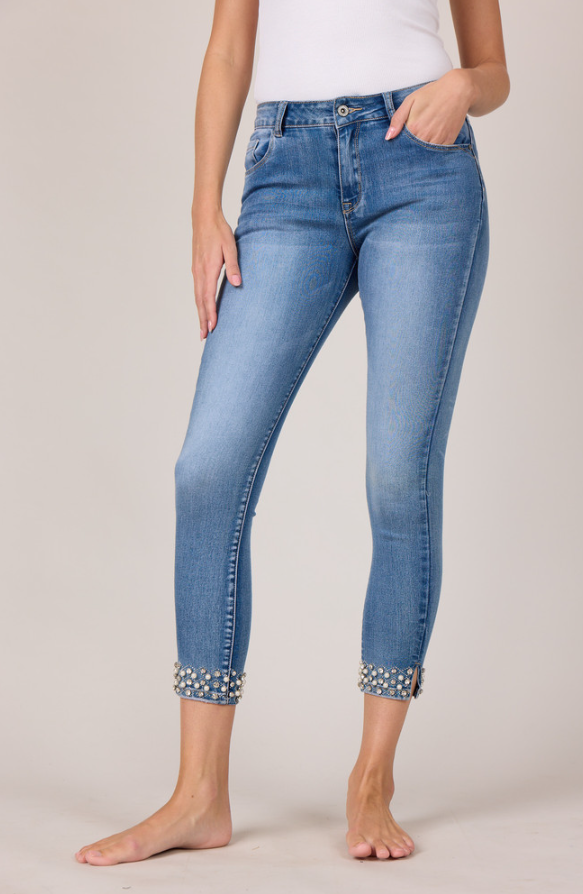 Jeans med perle og strass pynt nedest i buksekant. Knapp og glidelås for lukking.