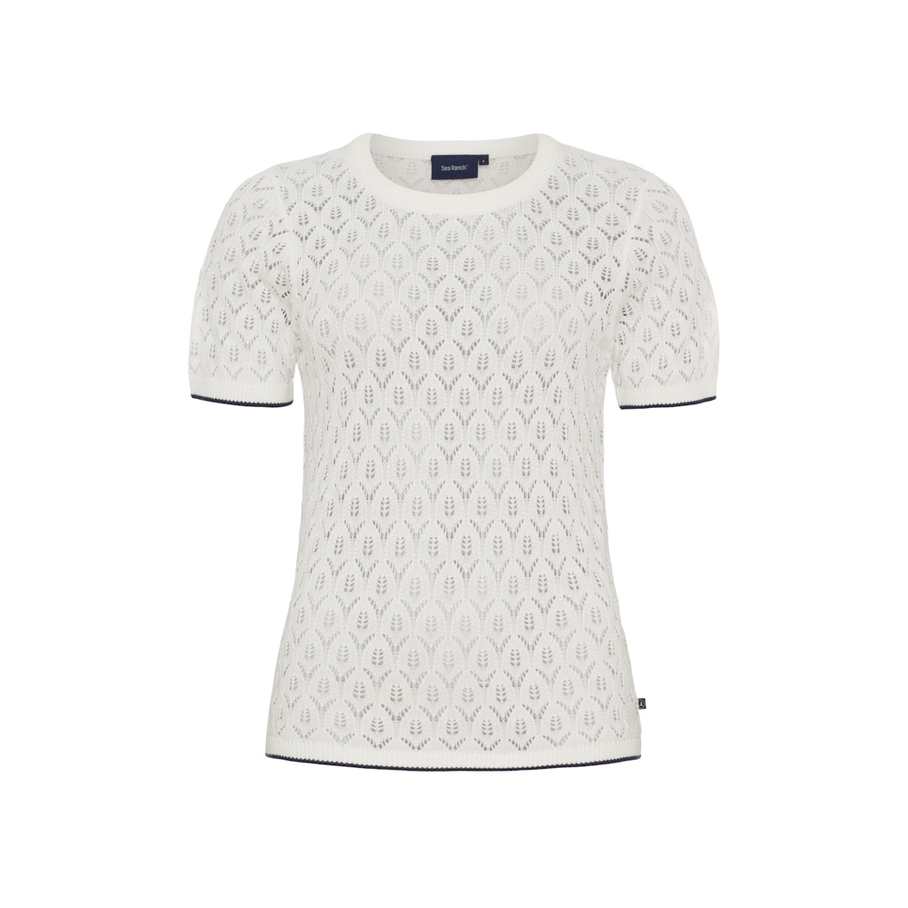 Strikket topp i lekkert mønster i offhwite. Lekker detalj som blå kant nederst på bol og armer.