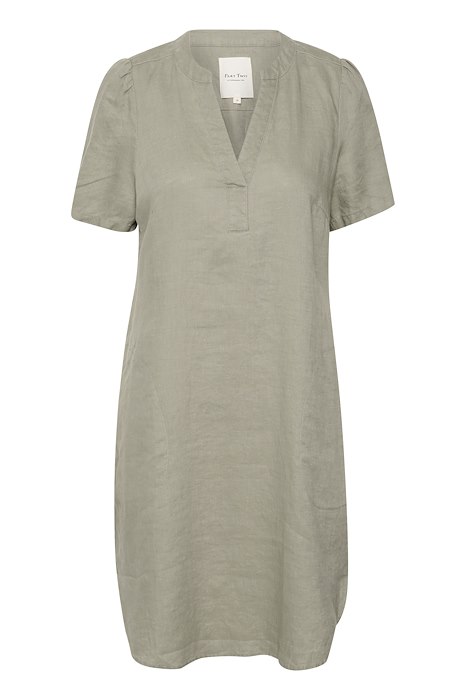 Dette er en superfin klassisk linkjole fra Part Two. V hals, korte armer. Kjolen er lett innsvinget, knelang og lett buet nederst.