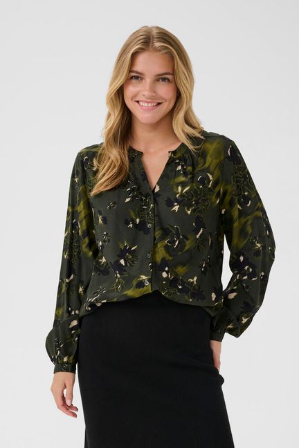Lekker mønstret bluse med V hals og knapper. Litt puffet arm med en knapp i mansjetten.