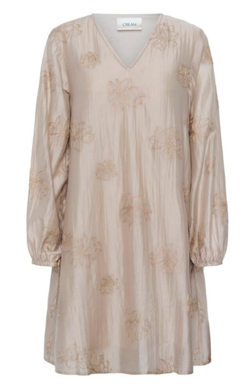 Elegant kjole med nydelig mønster. Brodert blomster mønster som går ton i ton.med v hals og lang arm.
