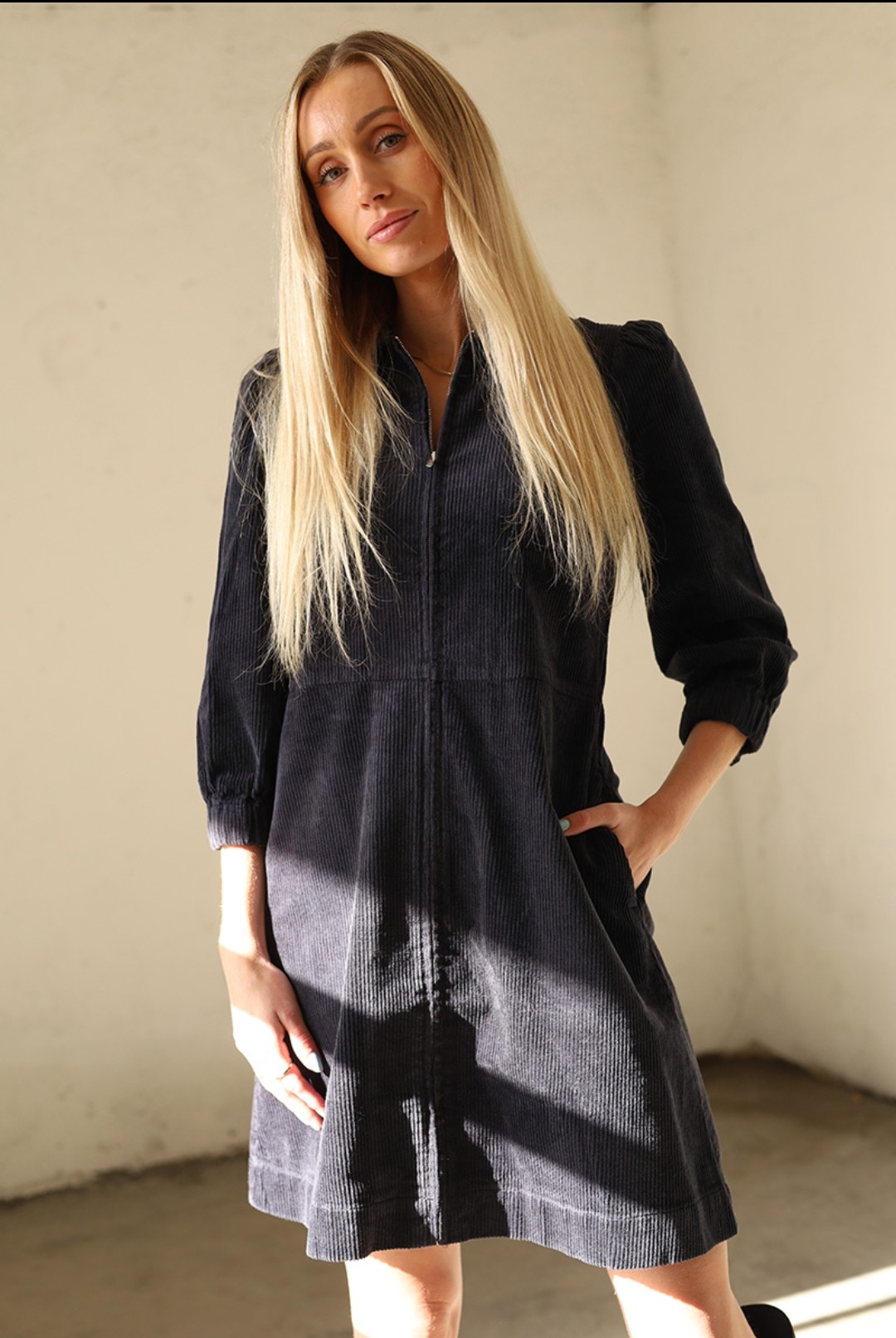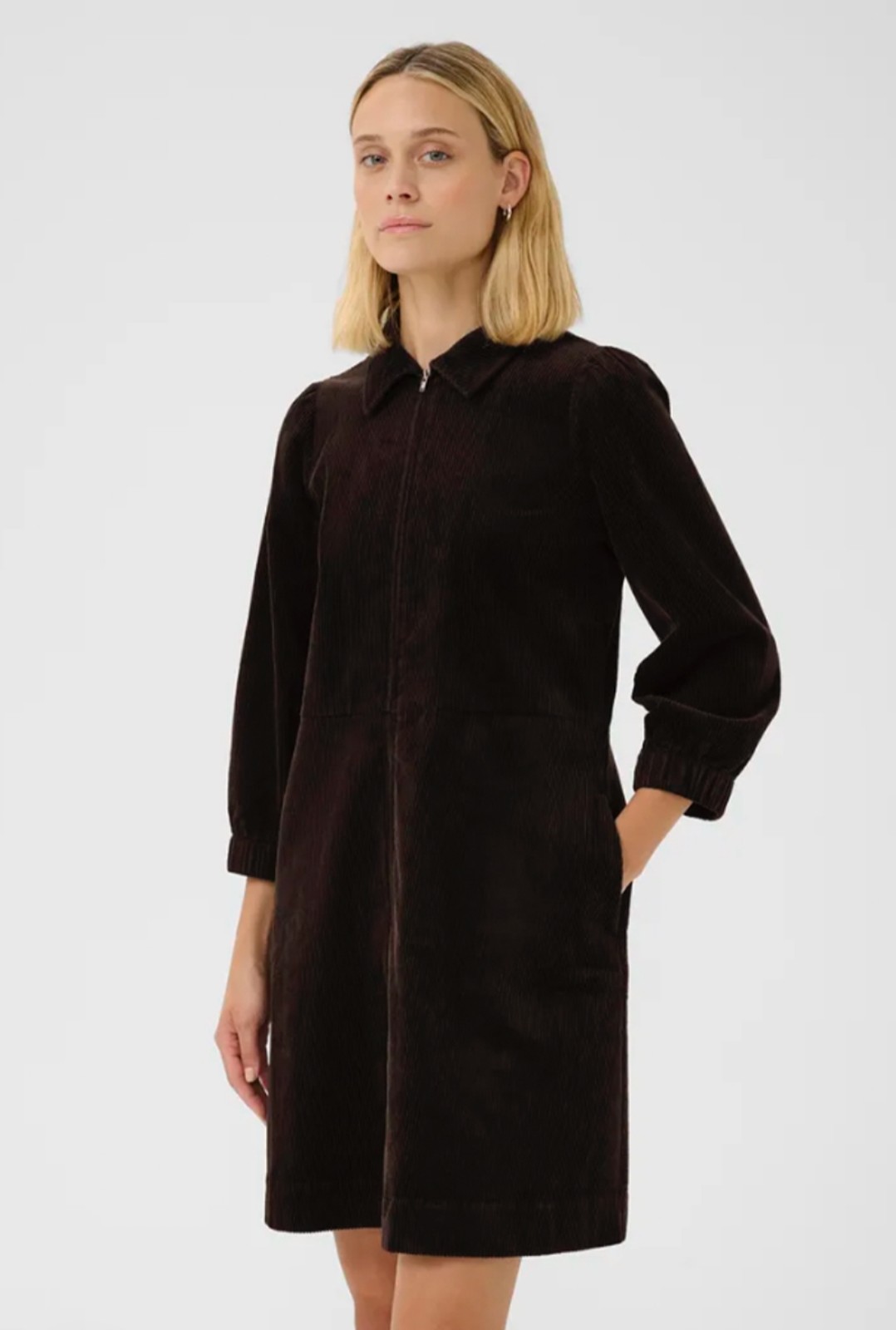 Lekker cordfløyel kjole med glidelås foran for lukking. 3/4 ermer med strikk nedest.