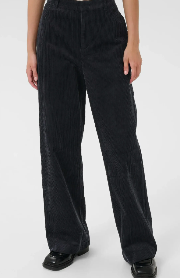 Breistripet cord bukse med vide bein. Hemper og glidelås foran for lukking.