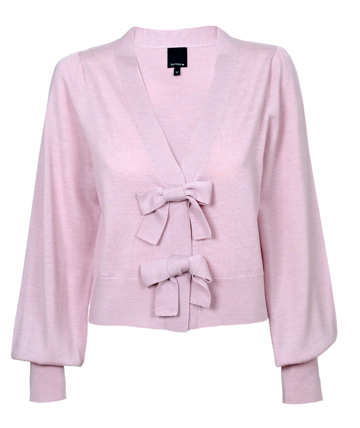 Lekker ullcardigan med sløyfer foran. Skjulte trykkeknapper foran for åpning.