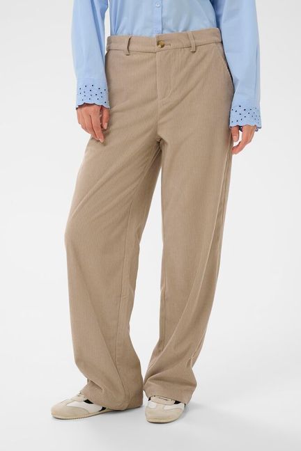 Cord bukser som er rette i beina. Beltestropper og lukkes med knapp og glidelås.