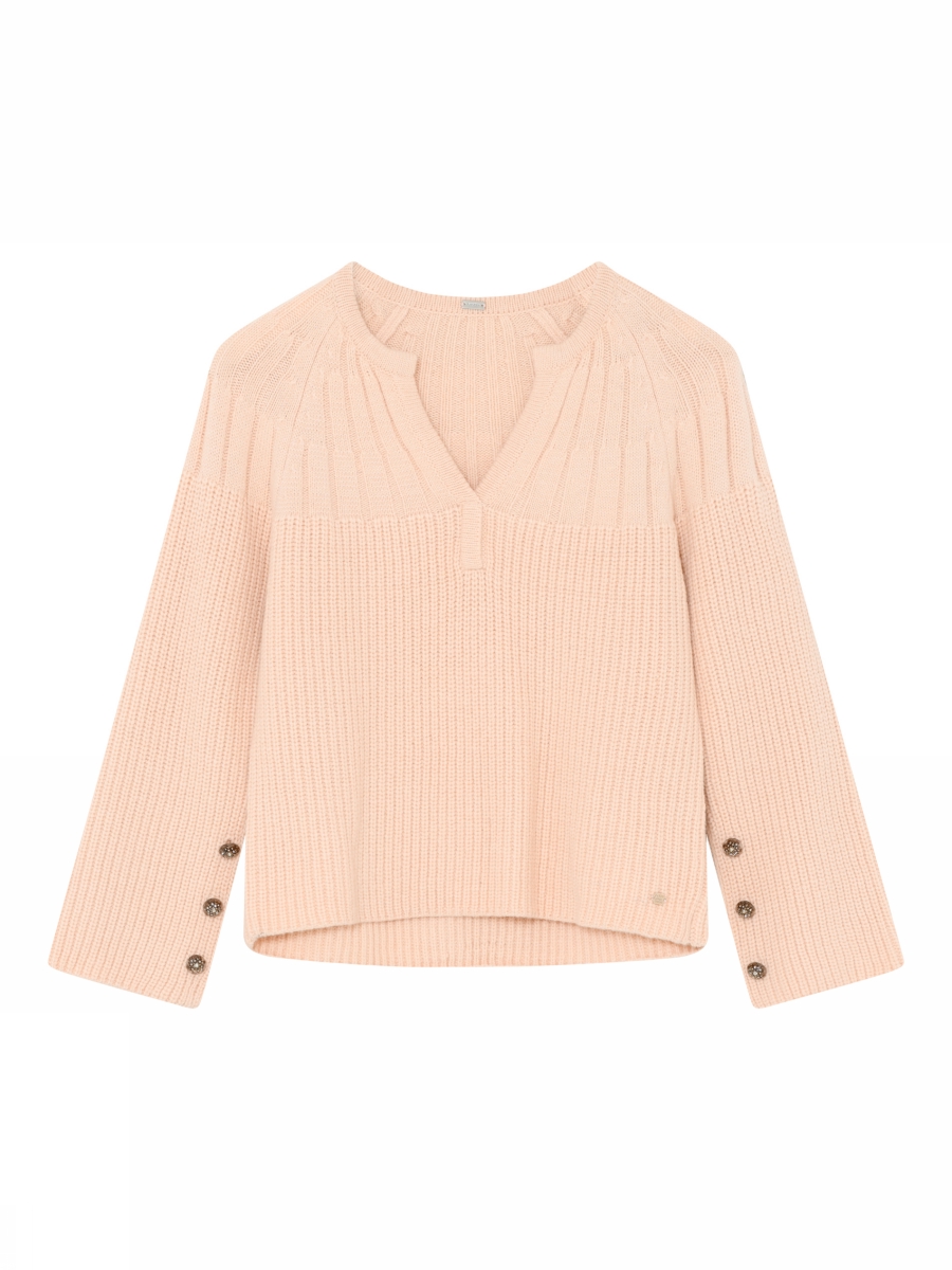 Genser med v-hals og mønstert strikk rund skuldrene. Lekre knapper nederst på armene.