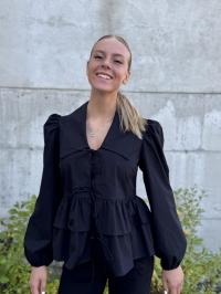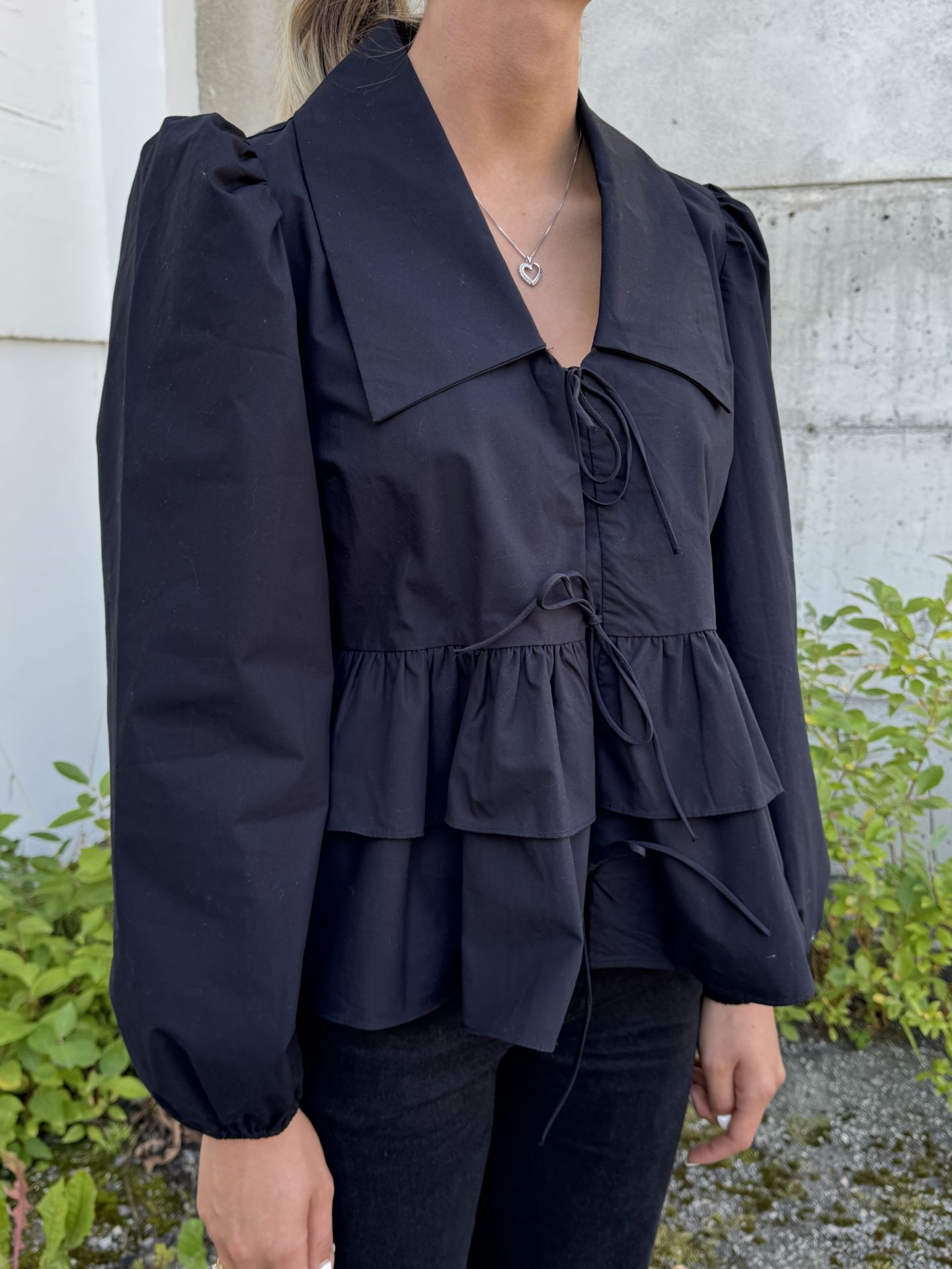 Skjorte med stor krage og knyting foran. Puffermer og volanger nederst på skjorten.