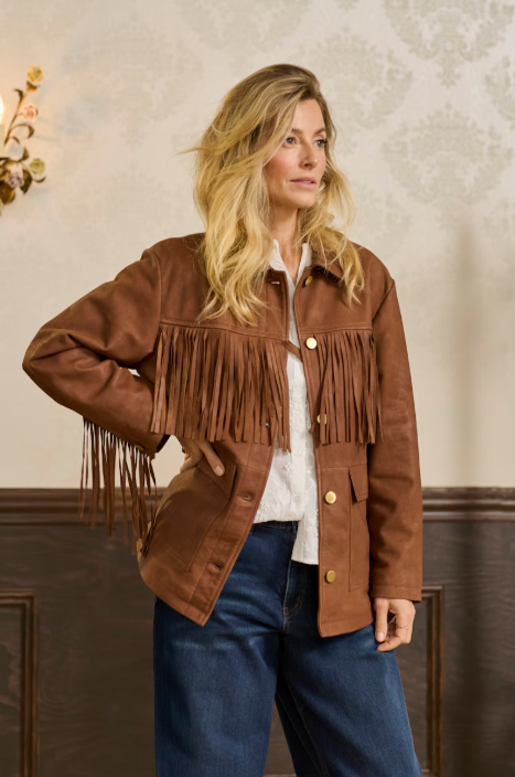 Stilig jakke i semsket skinn med frynser over brystet og på armene. Store lommer foran og lukkes med knapper.