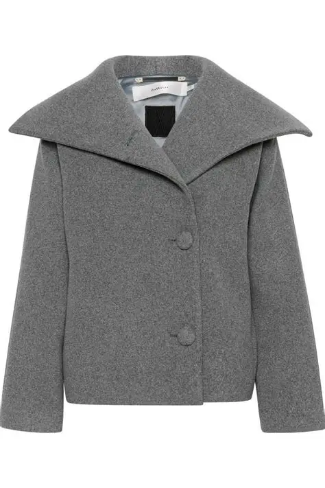 Klassisk ulljakke i lett A- fasong med 2 store knapper foran. Deilig stor hals ,som er like fin brettet ned som brettet opp og lukket. rekker ned til midt på baken.