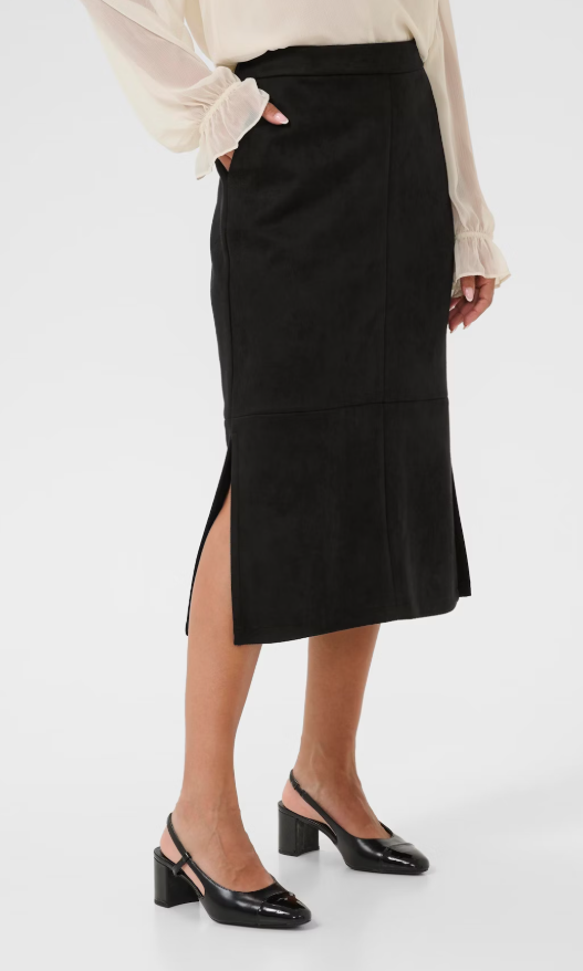 Strech skjørt i skinnimmitasjon. Strikk i livet. Skrå lommer å¨sidene. Splitt på begge sidene.