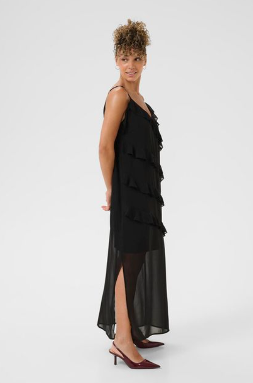 Festkjole med justerbare stropper og volanger.Underkjole under.