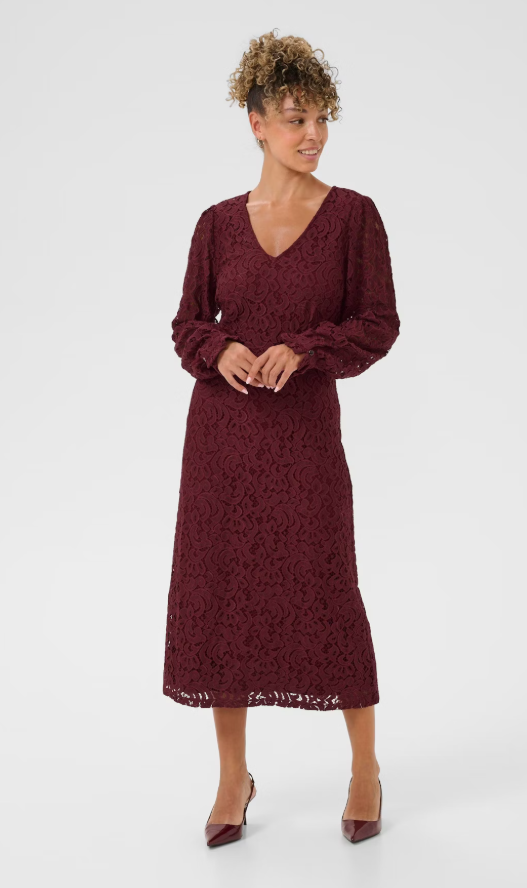 Blondekjole med glidelås og knapp bak for lukking. Foret. V-hals.