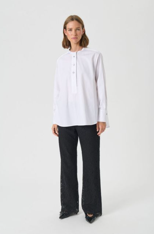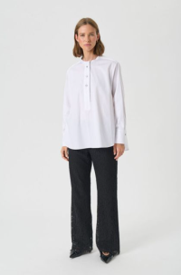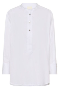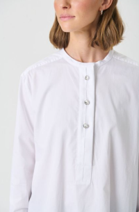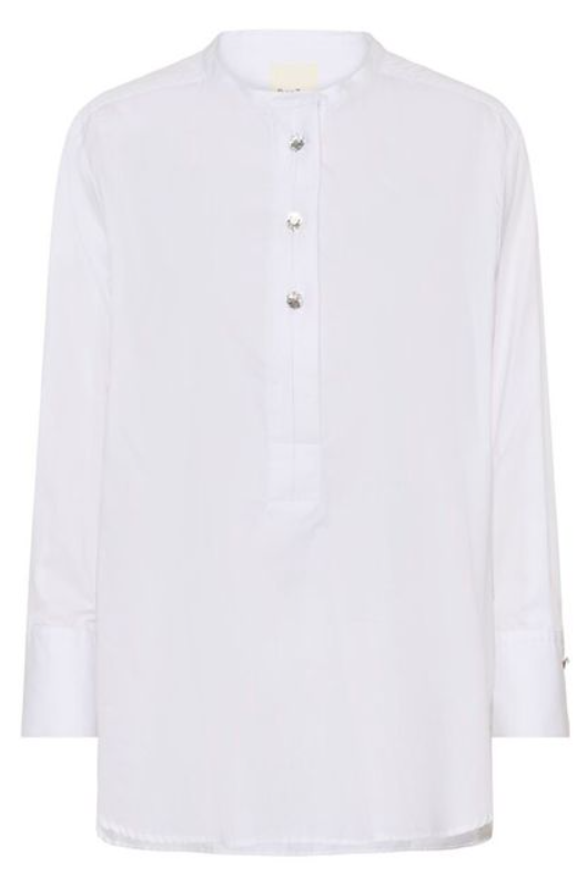 Enkel og fin skjorte,med rund hals og tre knapper. Bunnen av skjorten er buet og litt lengre bak.