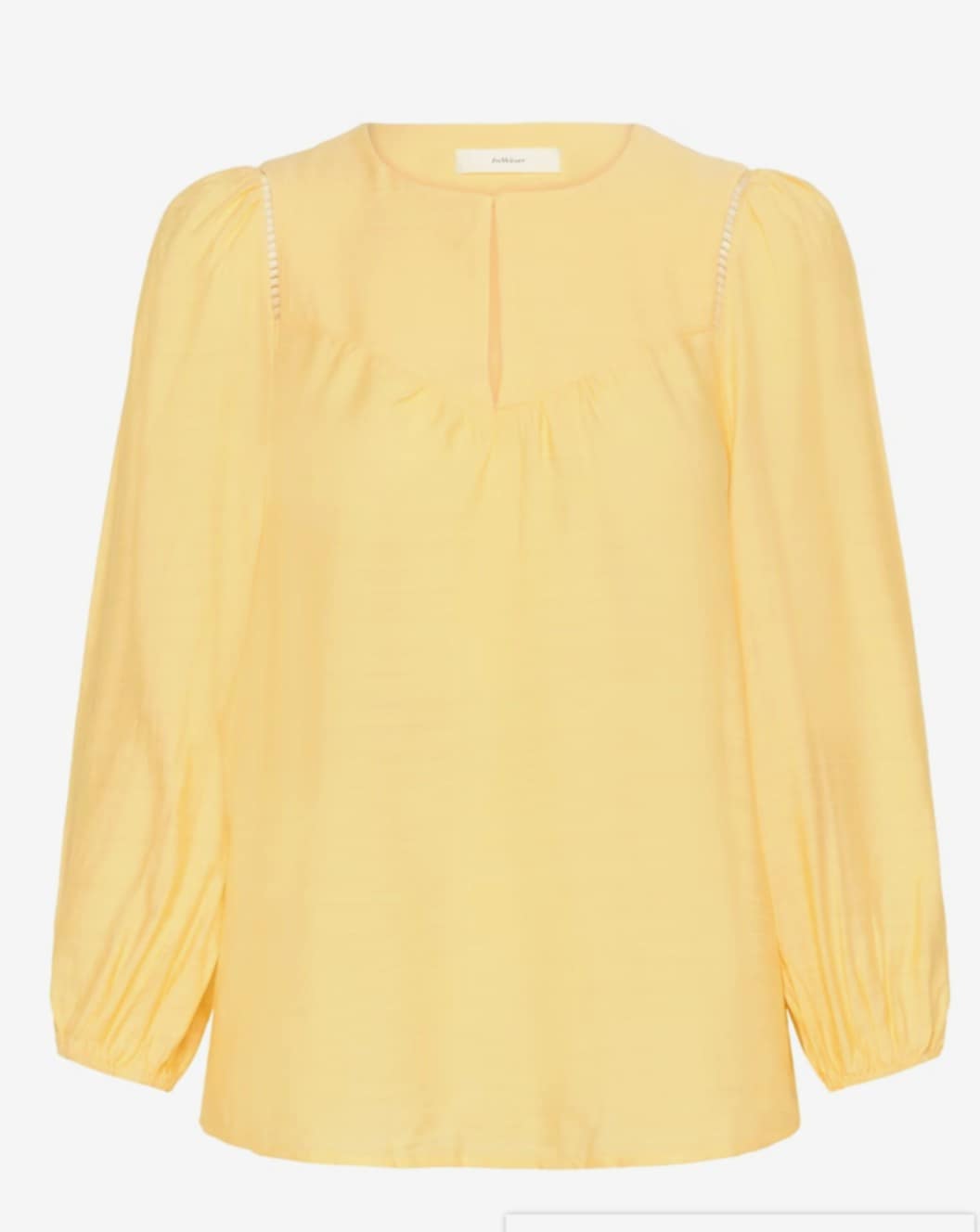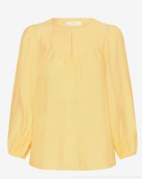 Blusen har knapp foran for lukking. Lett puff ermer. Strikk nedest på ermene.