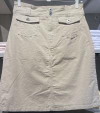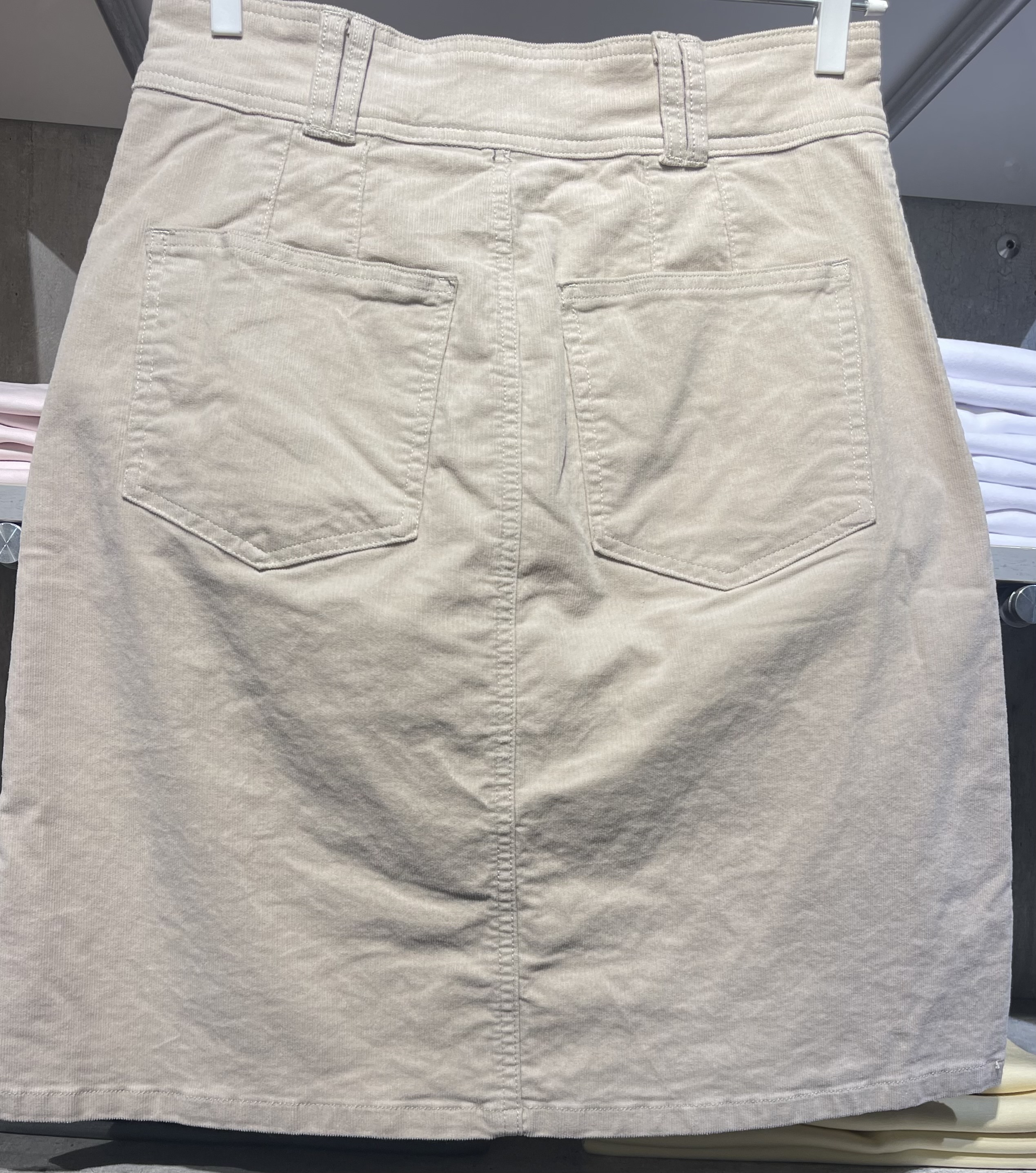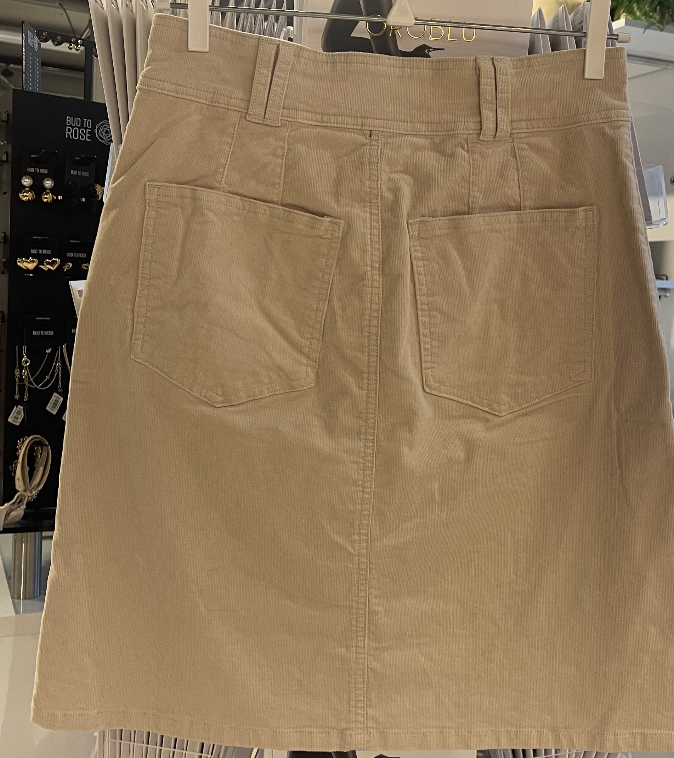 A-fasonget cord skjørt.Lommer foran. Knapp og glidelås foran for lukking.