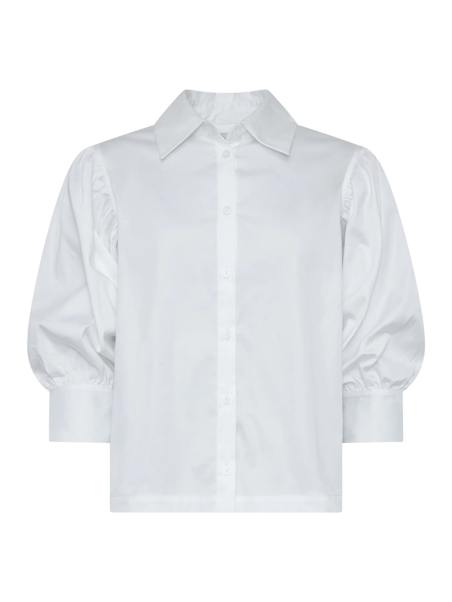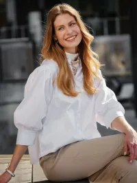 Stilig bluse med puff ermer og krage. Knapper på armene og forran for åpning.