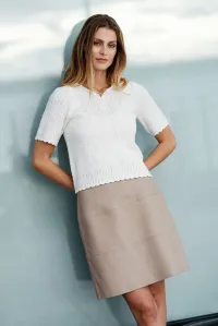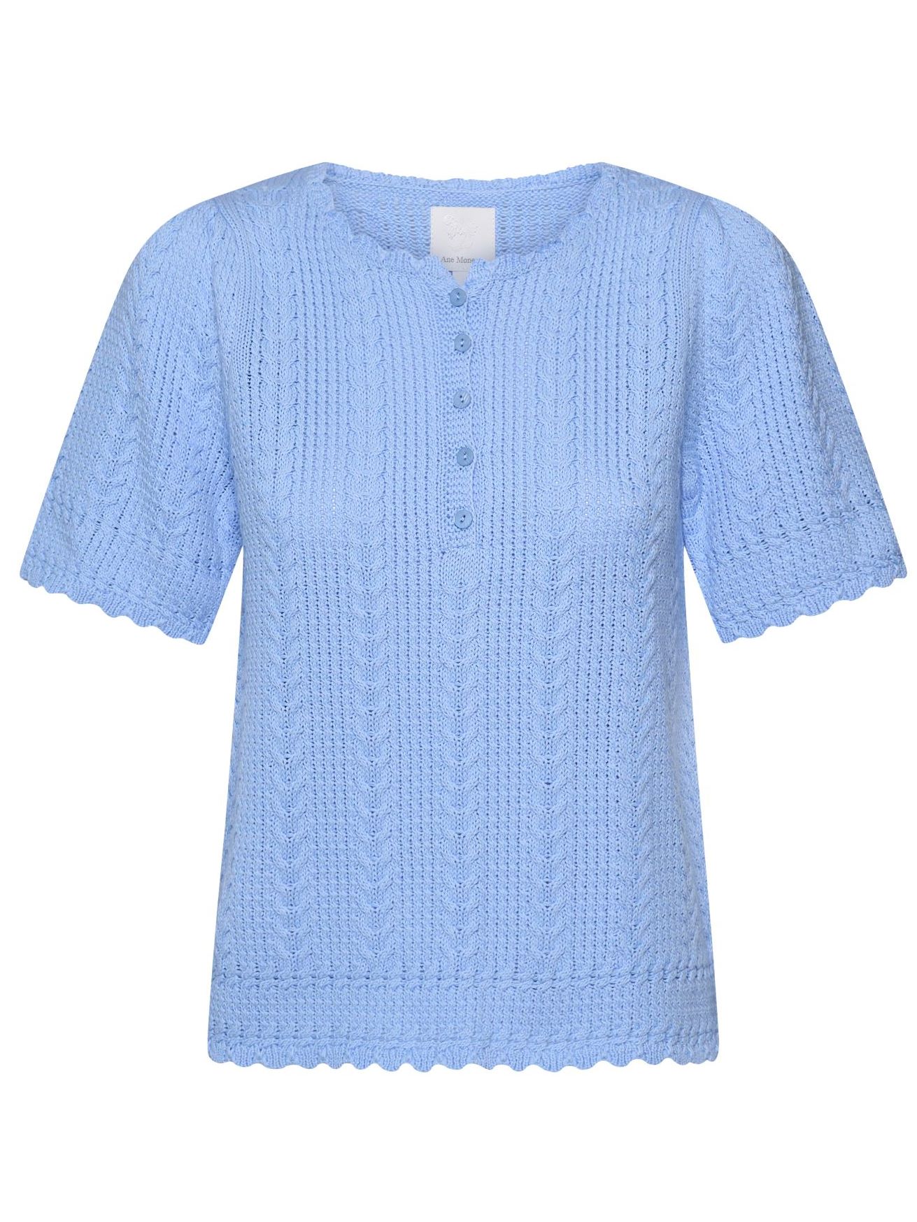 Søt pullover med korte puffermer. 5 knapper foran for åpningen i halsen.