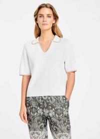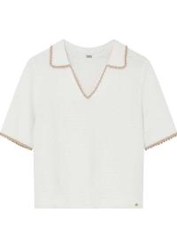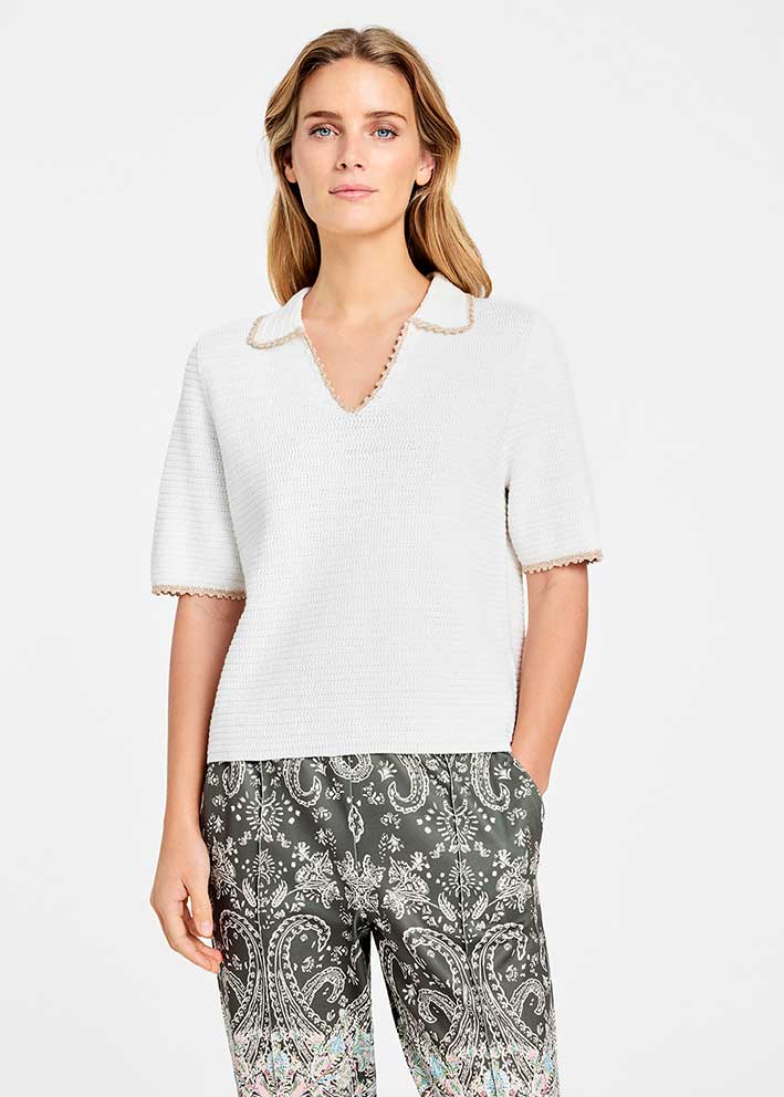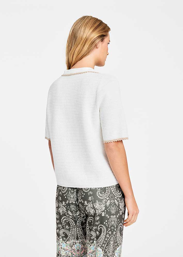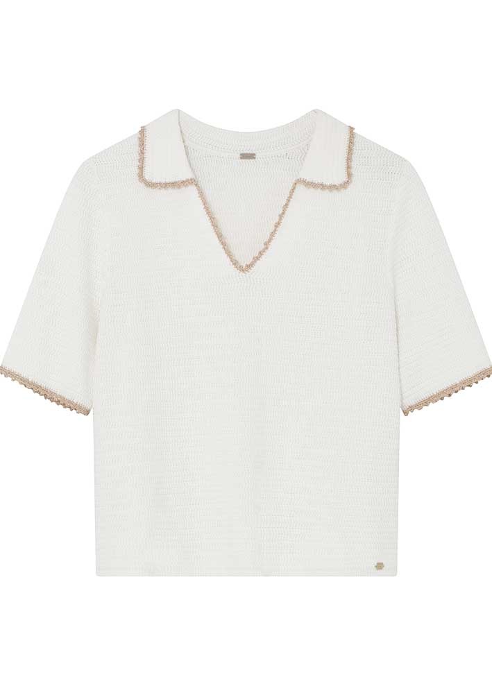 Strikket topp med gullkant i halsen og på endene på ermene. V- hals.