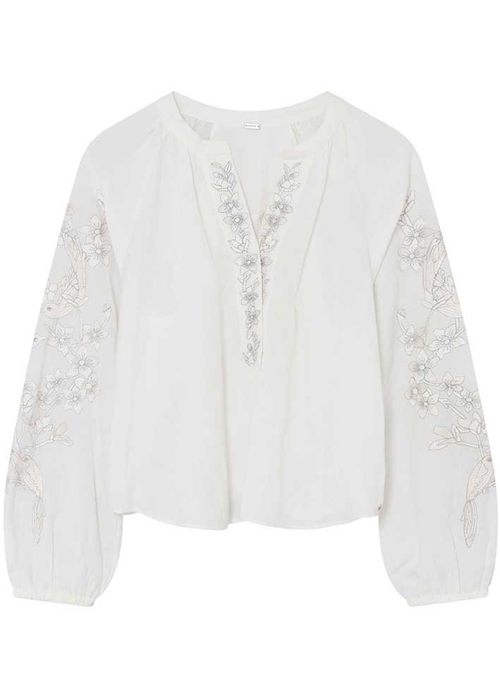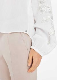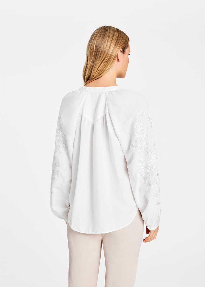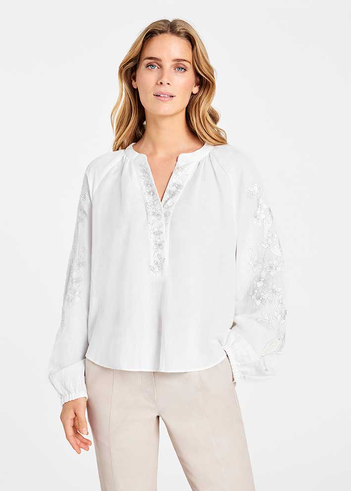 Nydelig bluse i linblanding. Broderier på ermene og foran. V-hals. Ledig passform.