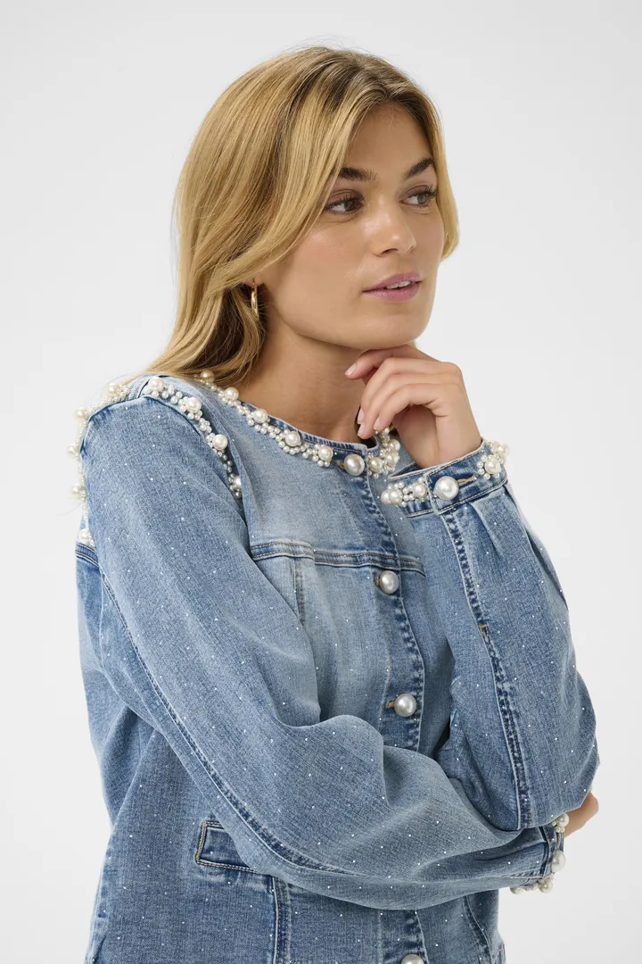 Denim jakke med perle og strasspynt. Perleknapper foran for lukking.