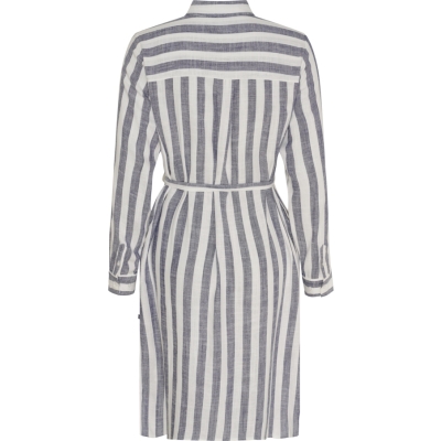 Stripete kjole i linblanding. Skjulte lommer på sidene. Belte i livet og knapper foran for lukking.