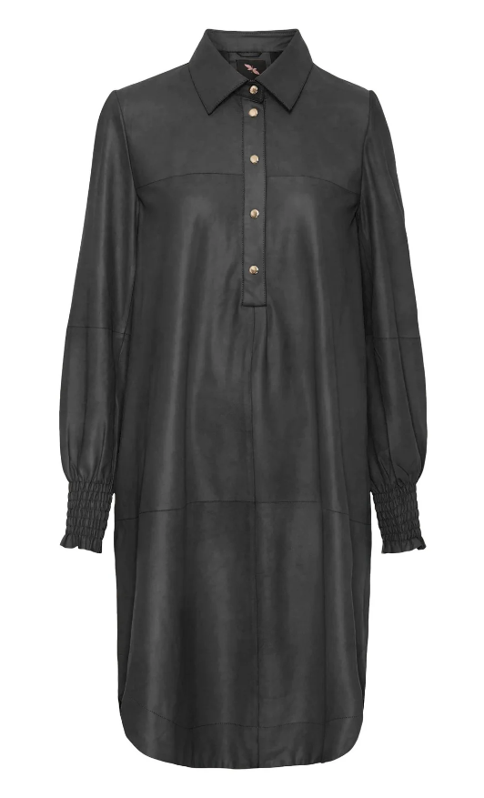 Nydelig høstkjole i ekte skinn. Den har trykknapper foran, samt en krage i halsen. Det er skjulte lommer på sidene av kjolen og den går litt lenger ned bak.