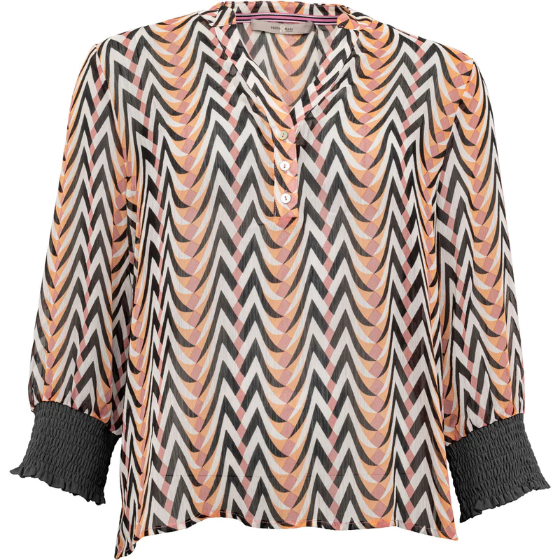 Pen plissé bluse med v-hals og et par knapper nedover. Blusen har også strikk nederst på ermet i sort.